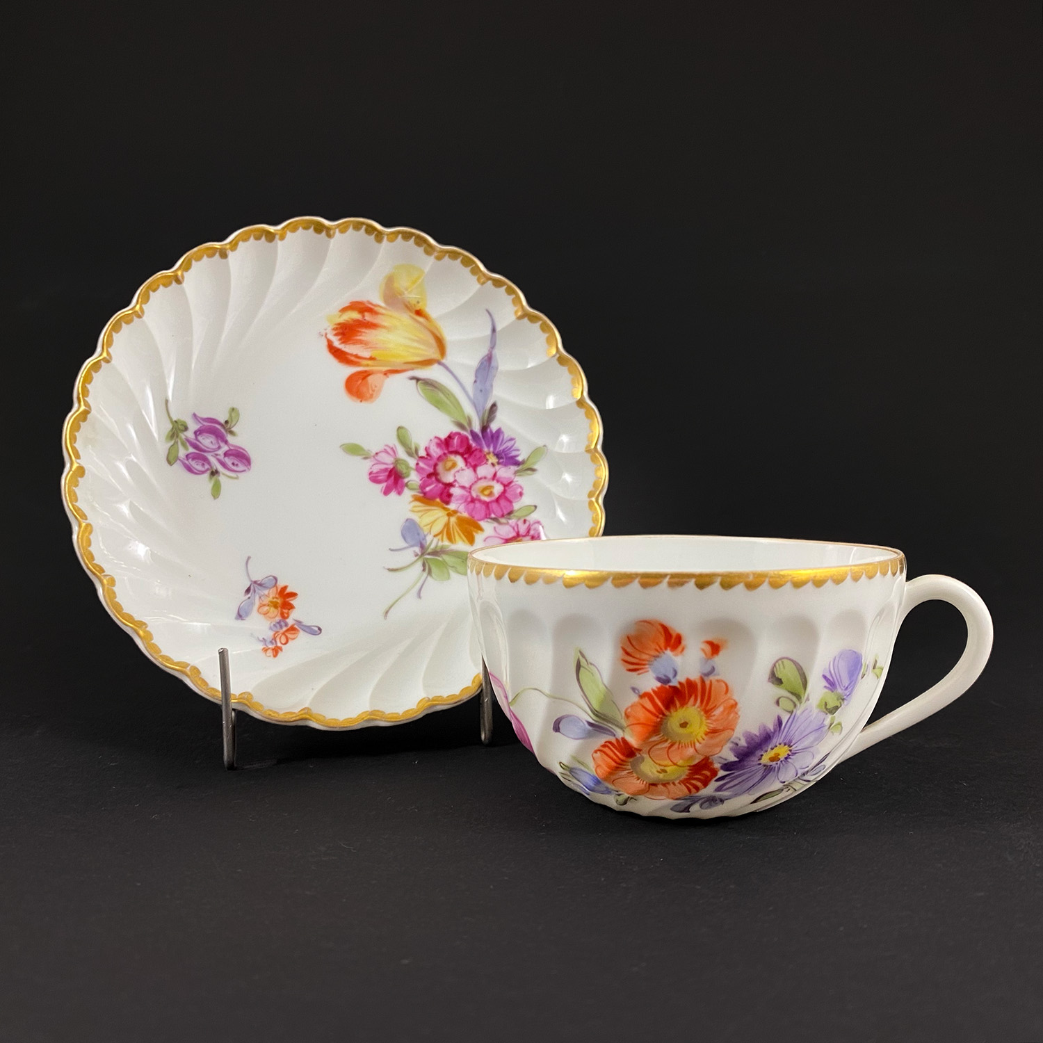 Porcelana biała, złocona, dekorowana malowanymi bukietami kwitów.