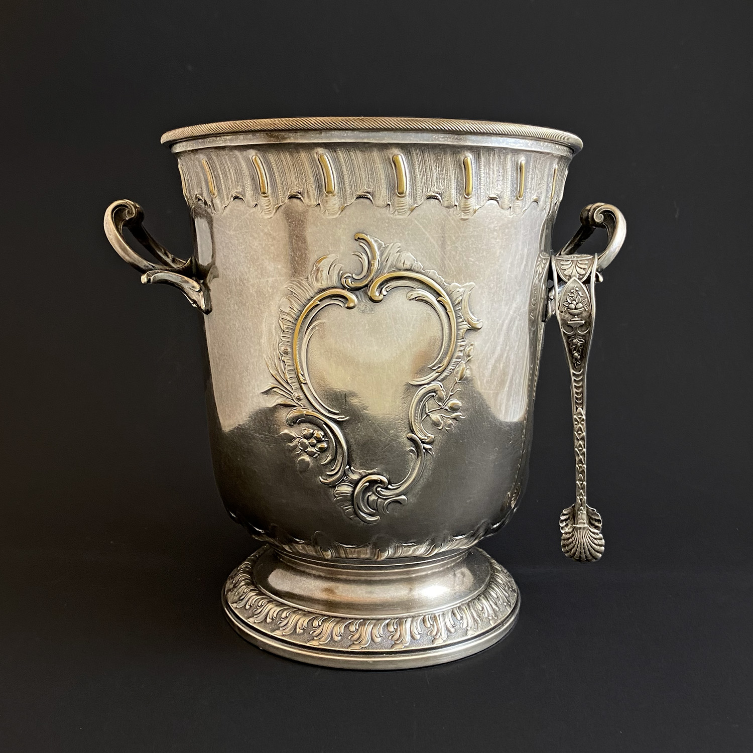 Cooler do chłodzenia szampana w stylu Ludwika XV. W ofercie sprzedaży są także srebrne szczypce do kostek lodu.