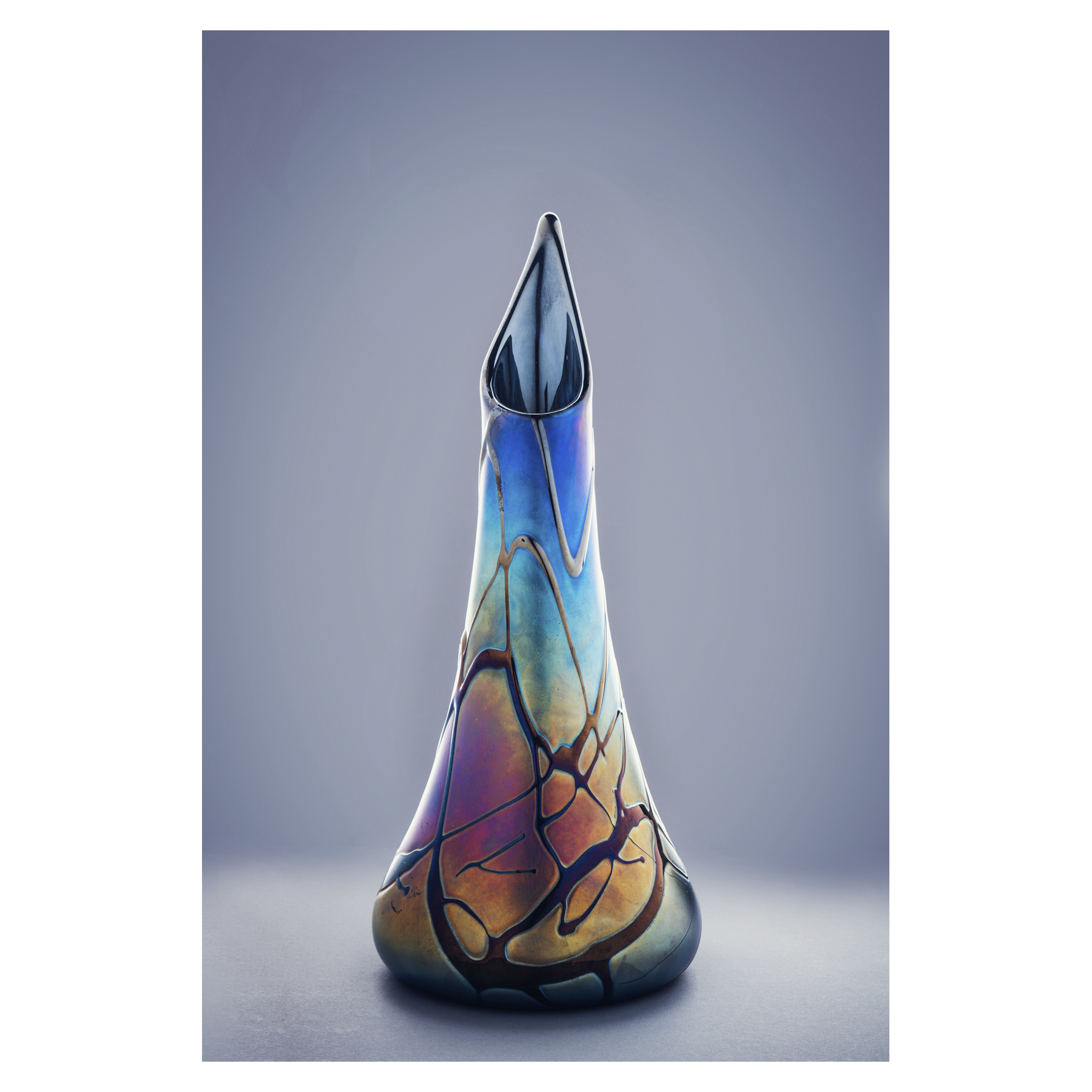 Szkło bezbarwne z nawiniętymi nitkami szklanymi, lazura srebrowa, opalizacja: fioletowa, różowa, żółta. Wymiary: 31,8 x 13, 8 cm Stan zachowania: bardzo dobry.